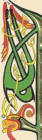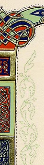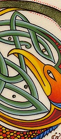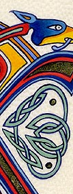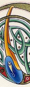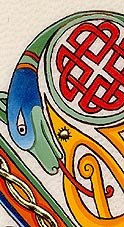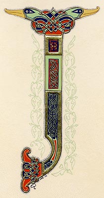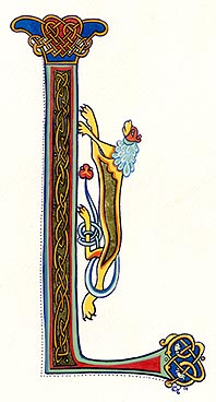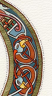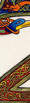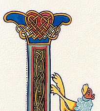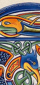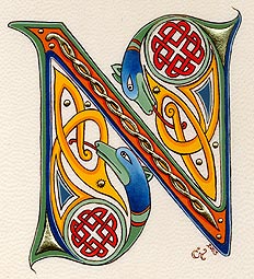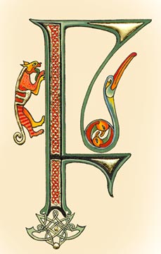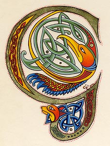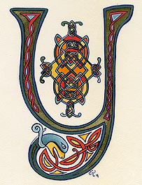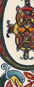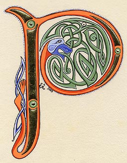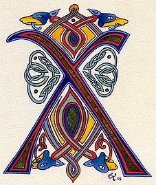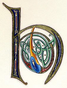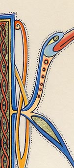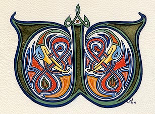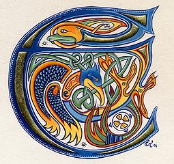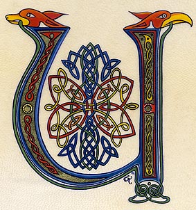 Lettrines de style celte interprétées à partir des dessins de A. Whitson ou inspirées du Livre de Kells, du Livre de Durrow ou du Lectionnaire de Montmajour. Peau de chèvre ou veau, feuille d'or 22 carats sur mixtion, détrempe médiévale. 90 € l'unité sans cadre (parchemin marouflé sur carton-bois d'environ 13 x 18 cm ou 15 x 15 cm). Lettrines actuellement en vente : C, H, K, L, O, P, U, W, X, Y et Z. Les autres sont réalisables sur commande.