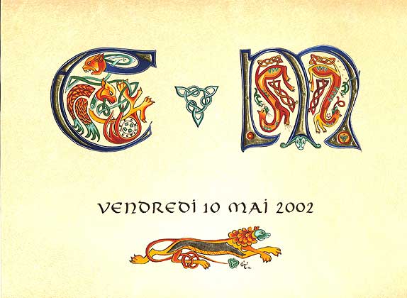 Lettrines "C" et "M" celtes avec intégration des animaux fétiches des époux (lion et chat) Calligraphie de la date de mariage