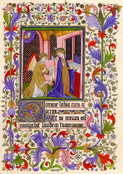 Reproduction of The Annunciation - Maître de Boucicaut - 1412. Kid skin, 22-carat gold leaf and powder gold, tempera painting. 18 x 13 cm
