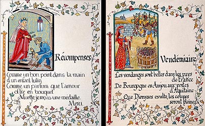| Intervention au Lycée Professionnel Bernard Palissy à Saintes sur le thème du calendrier révolutionnaire et de l'allégorie. | Elèves de CM1 travaillant sur l'illustration d'un conte écrit en classe. Le travail a été réalisé sur un papier "Rives". Les enfants ont appris à poser la feuille d'or sur mixtion et à peindre a tempera. |