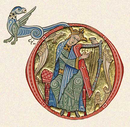 Lettrine "D" roman avec David jouant du psaltérion.