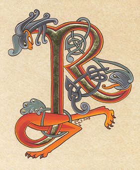 Lettrine "R" de style celte - Chevreau beige, feuille d'or 22 carats, tempera