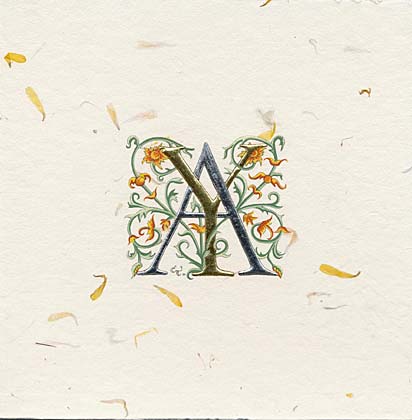 Lettrines "A" en or blanc et "Y" en or jaune 22 carats, réalisées sur papier fait-main avec incrustation de pétales.