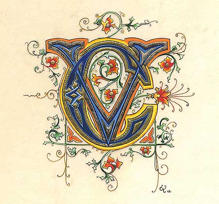 Lettrines "C" en or jaune et "V" en or blanc sur peau de veau.