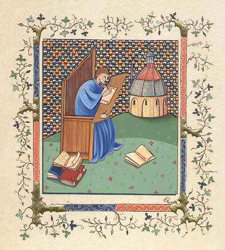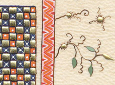 Scribe avec Octogone de Montmorillon - Chevreau beige, feuille d'or 22 carats, tempera. Damier de fond : 3 x 3 mm de côté.